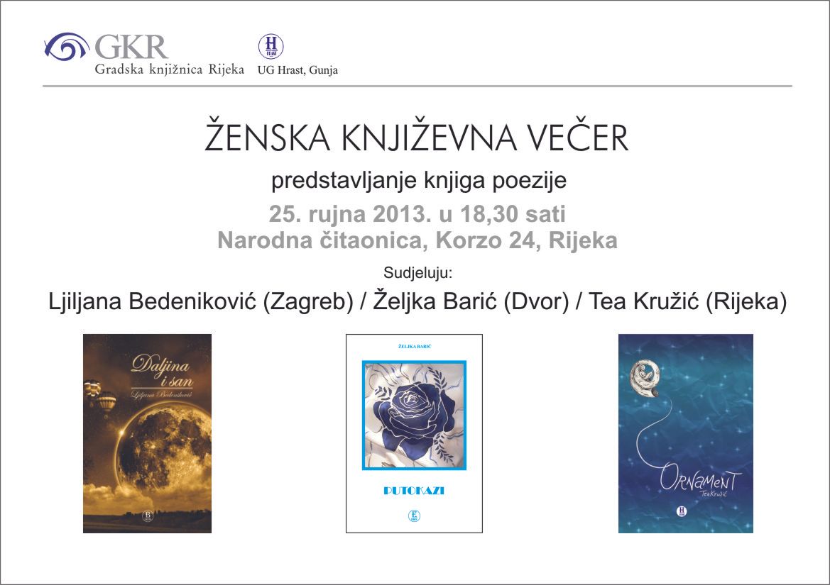 U srijedu 25. rujna u 18,30 u Narodnoj čitaonici, Korzo 24, u suradnji s Udrugom građana Hrast (Gunja), bit će održana ženska književna večer. Knjigama će se predstaviti Ljiljana Bedeniković (Daljina i san), Željka Barić (Putokazi) i Tea Kružić (Ornament).